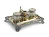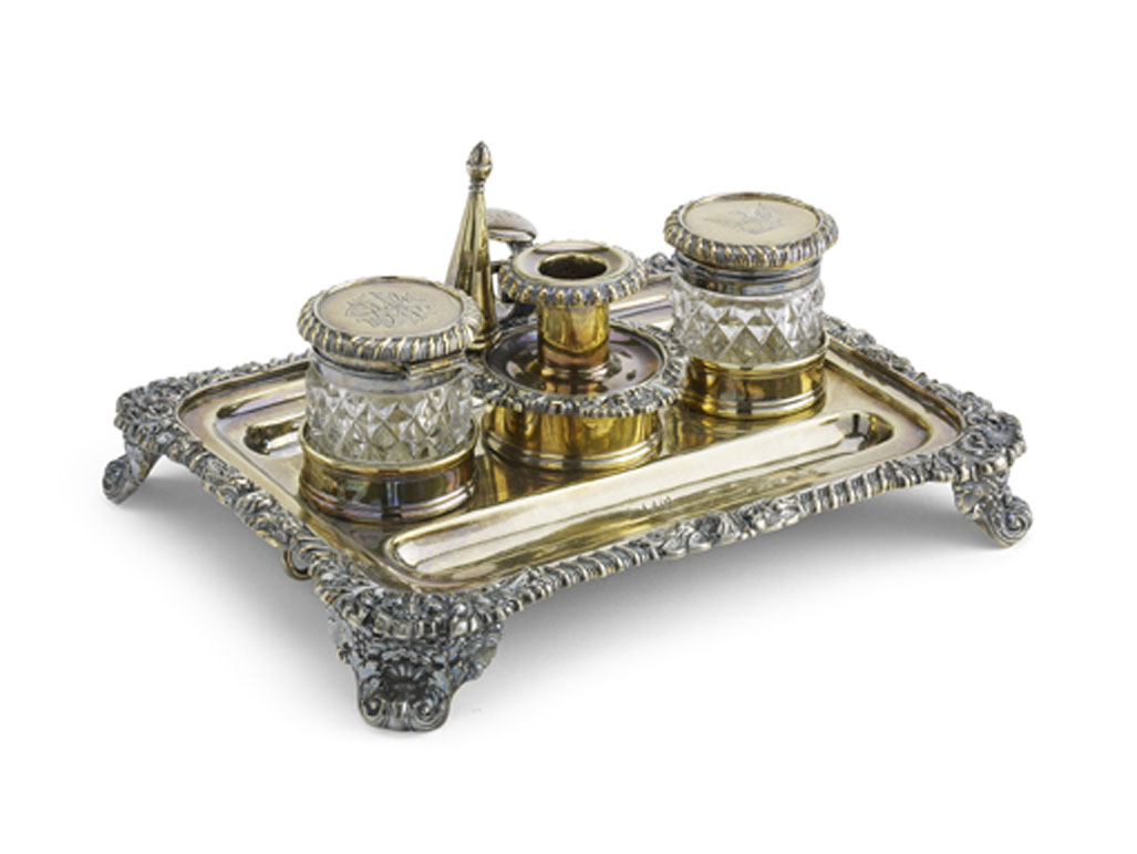 TI/NC Sheffield 1828, the stand or rectangular outline with raised gadrooned floral and shell border, with twin pen trays and set with two crystal inkwells with hinged lids and taperstick to the centre with a snuffer
