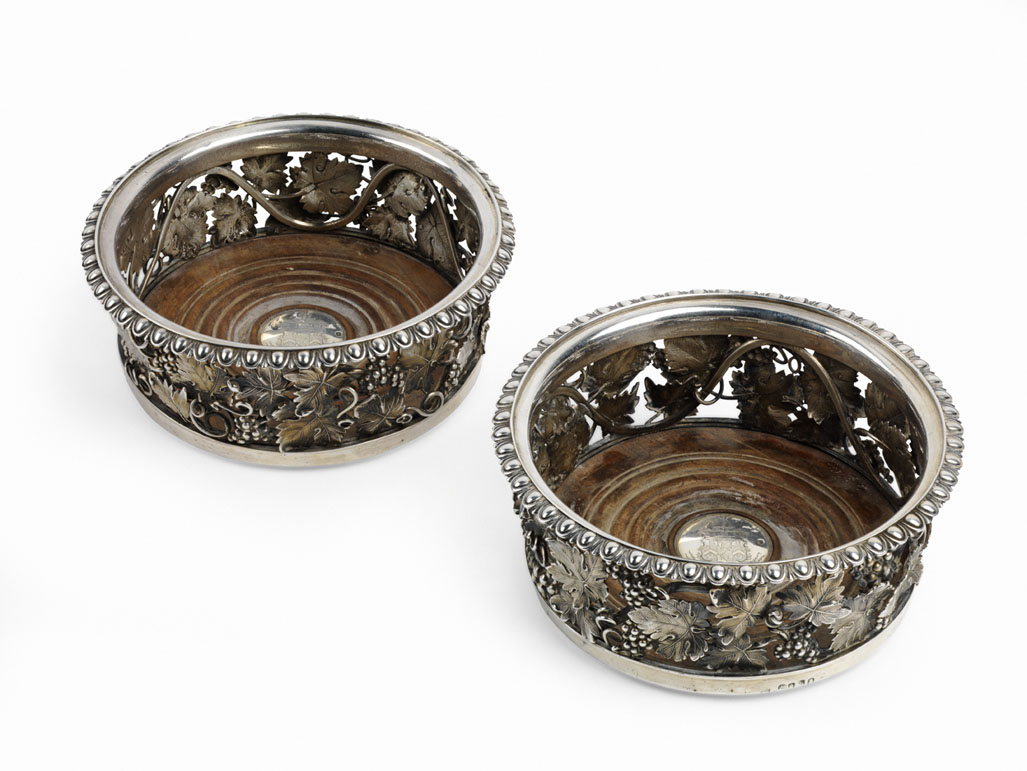 by W Ealey & W Fearn London 1823 with finely cast and chased openwork fruiting vine galleried body with ovolo everted rim, with turned wooden bases with circular boss to centre engraved with armorial (possibly that of Gurney) (2)