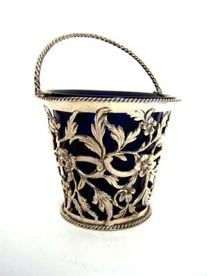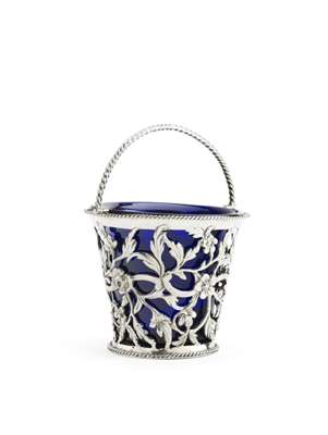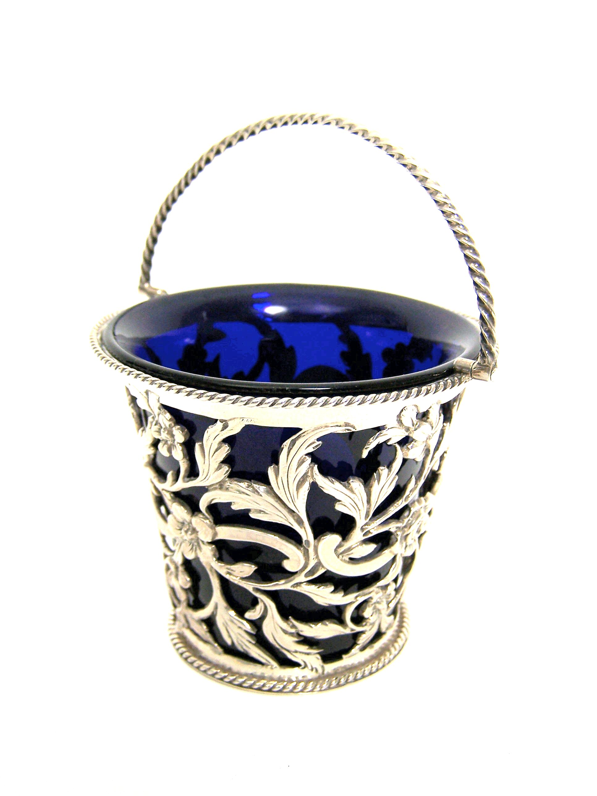William Terry London, 1769, the pierced foliate and scroll decoration with chased detail, with gadrooned foot and rim and twisted swing handle, with blue glass liner