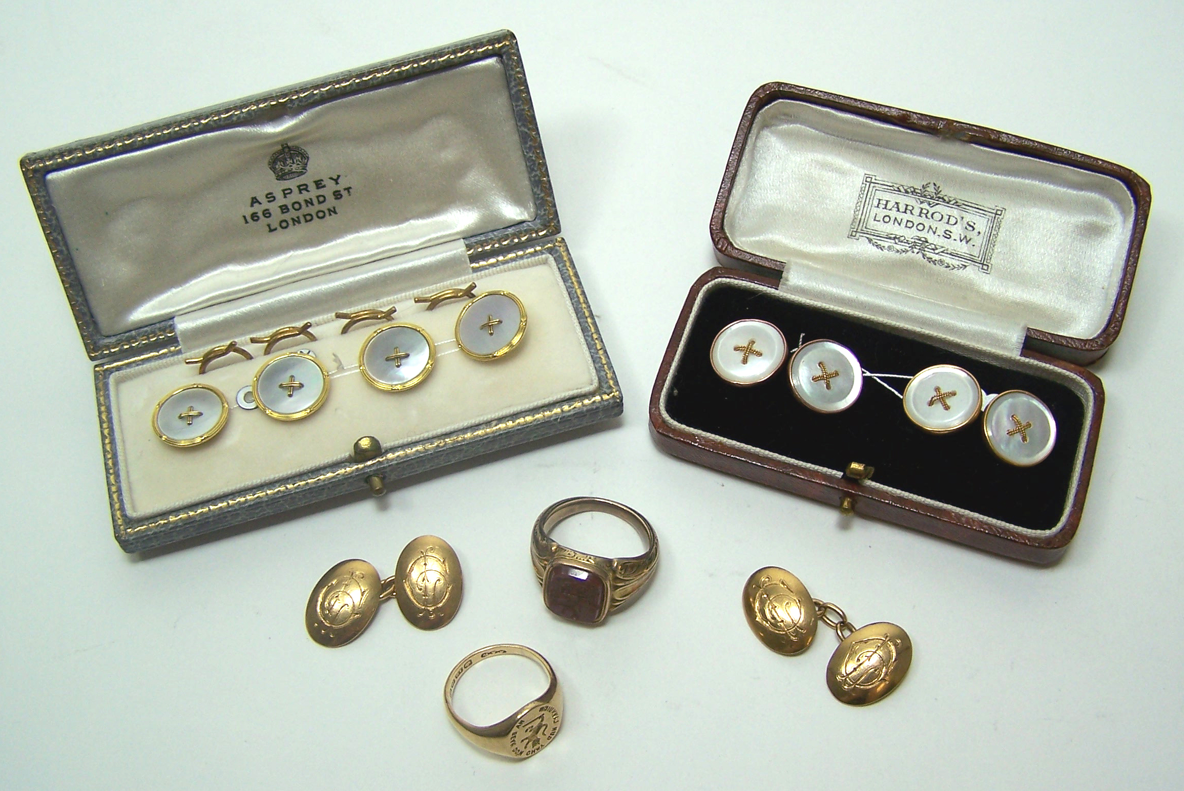 to include a pair of 18ct gold cufflinks, with monogrammed oval terminals, an 18ct gold signet ring, crested and inscribed, another signet ring, with central hinged locket collet set with a crested cornelian intaglio; a cased set of four 9ct gold mounted mother-of-pearl inset dress buttons; also a matching gilt metal pair of cufflinks (5)