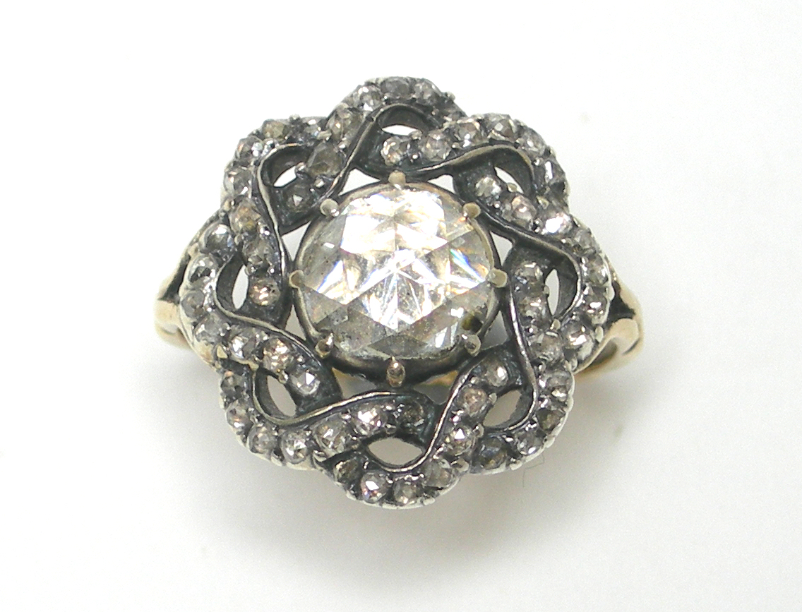 claw set to the centre with a circular rose cut diamond within a scrolling surround set with smaller similarly cut diamonds