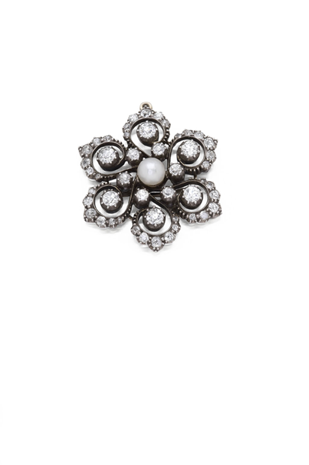 set to the centre with a bouton pearl within an open floral surround claw set with graduated old European and single cut diamonds, with detachable brooch fittings