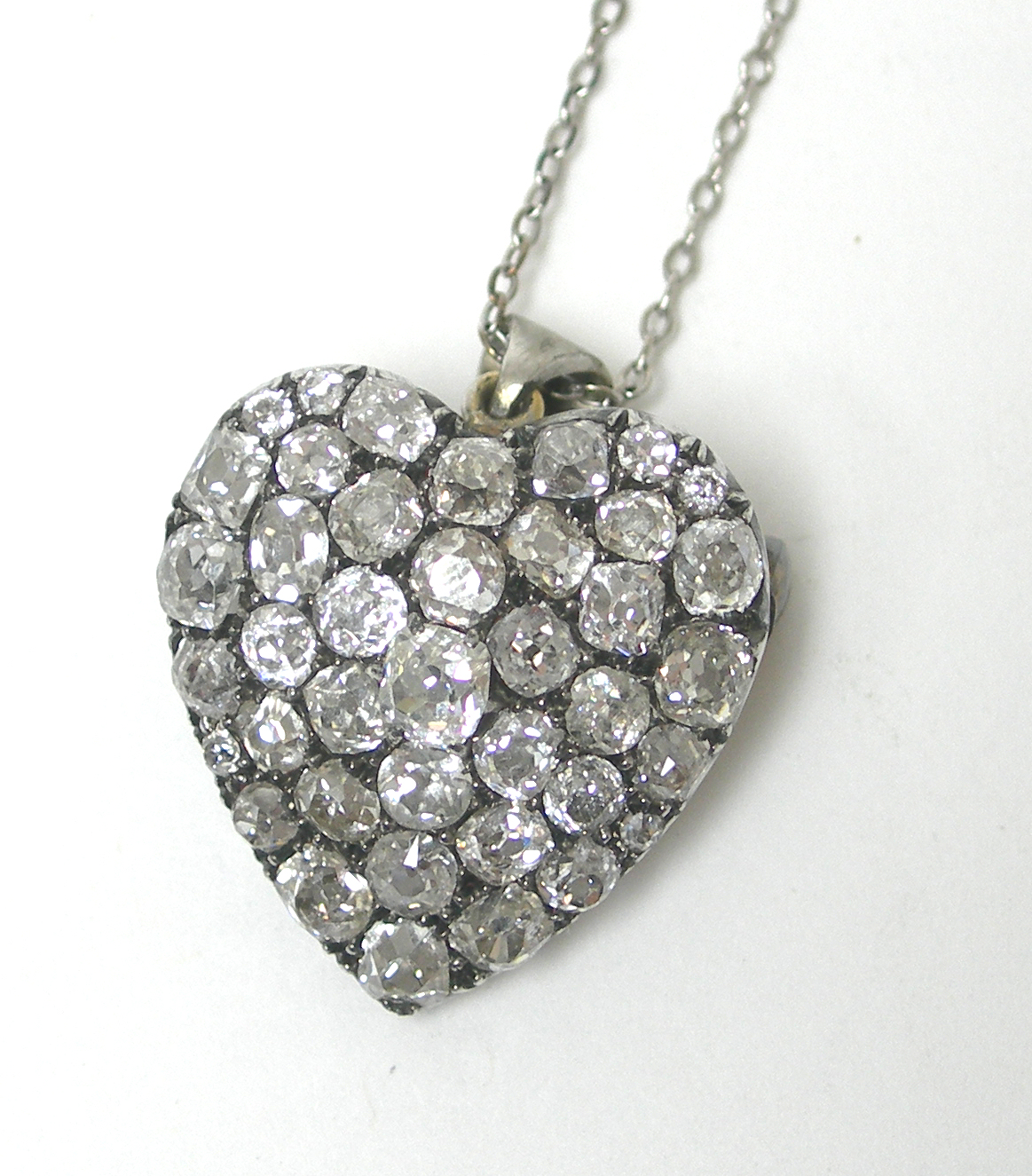 of heart design, pave set with graduated old mine cut diamonds, with hinged bale and trace link chain