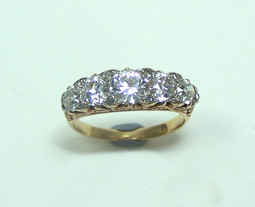 claw set with graduated old European cut diamonds with pairs of rose cut diamonds between and scroll pierced gallery