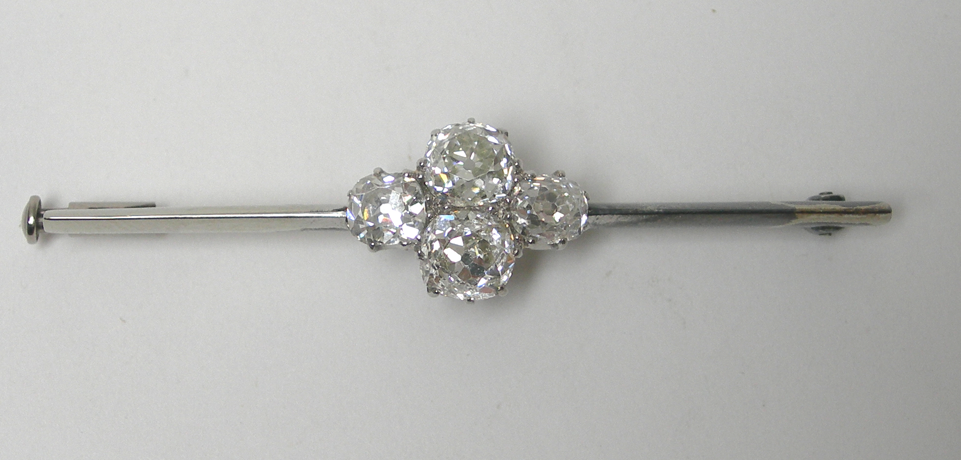 claw set to the centre with a cluster of four old mine cut diamonds, to a knife bar