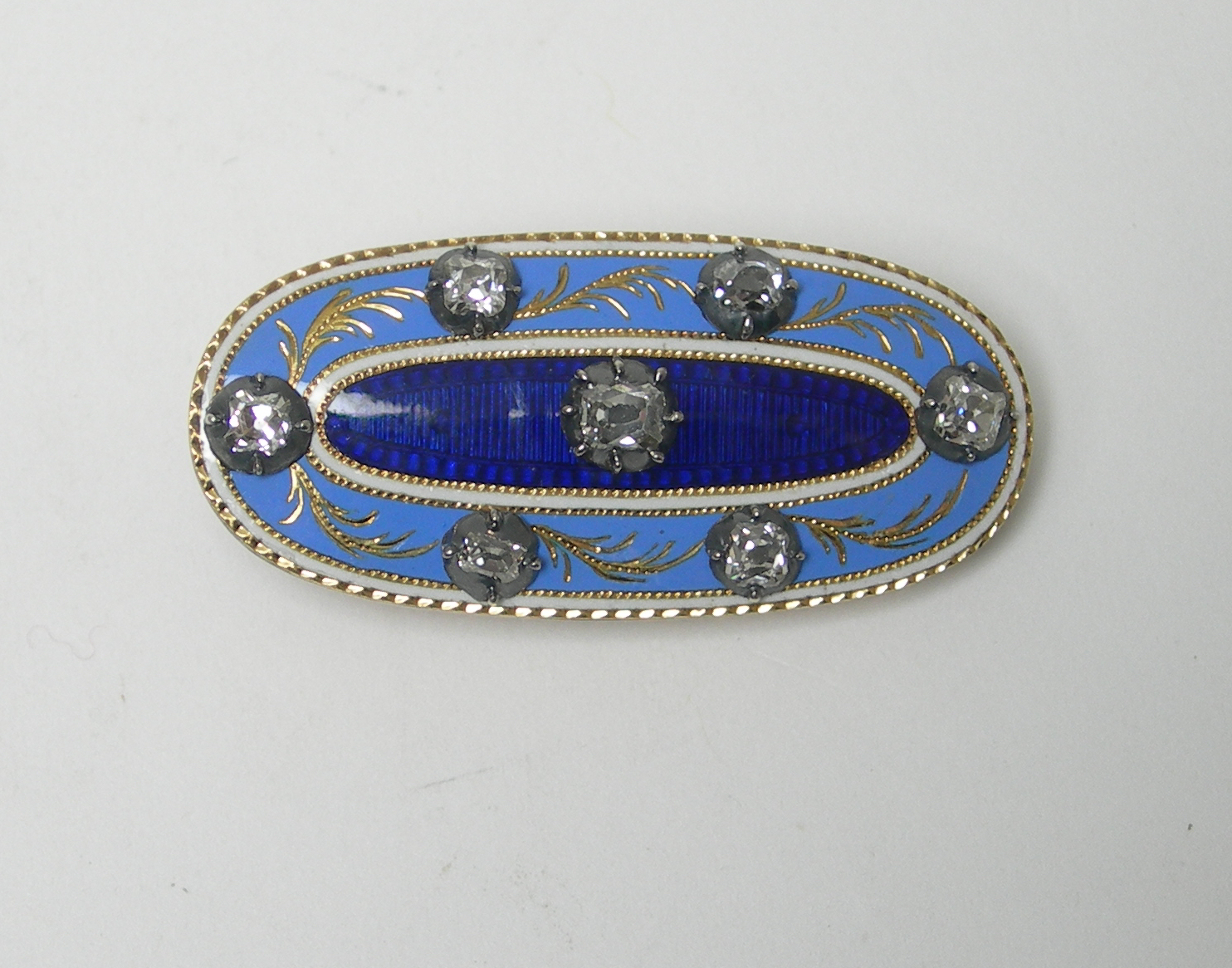 of slim oval design, claw set with seven old mine cut diamonds, to an enamelled ground decorated with white and two shades of blue enamel, with gilt scrolling foliate motifs