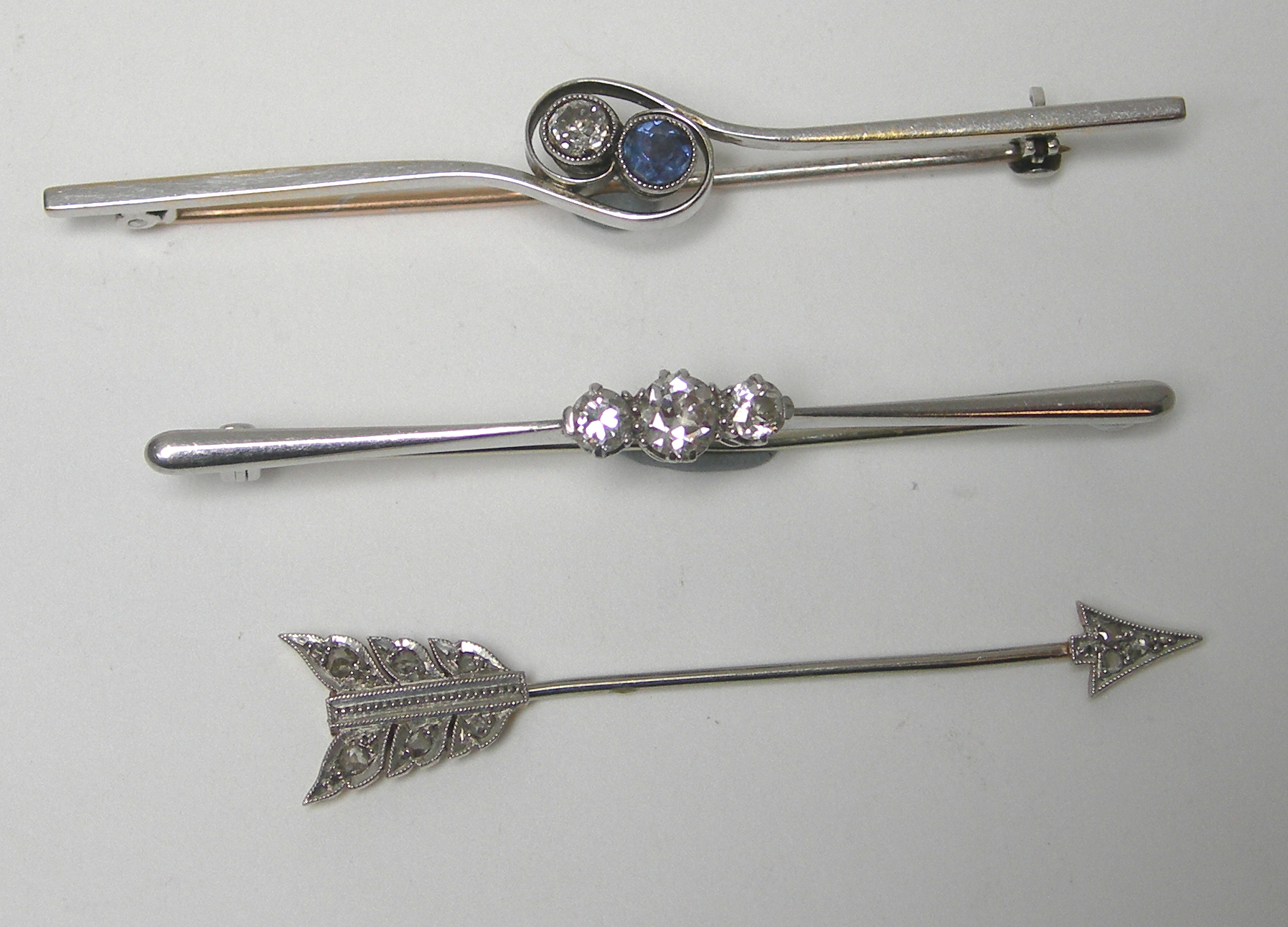 claw set with three graduated old European and early round brilliant cut diamonds; a rose cut diamond set arrow form surete pin; and an 18ct white gold mounted bar brooch, diagonally millegrain collet set with a circular cut sapphire and round brilliant cut diamond, within a scroll surround to a tapering bar (3)