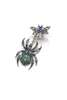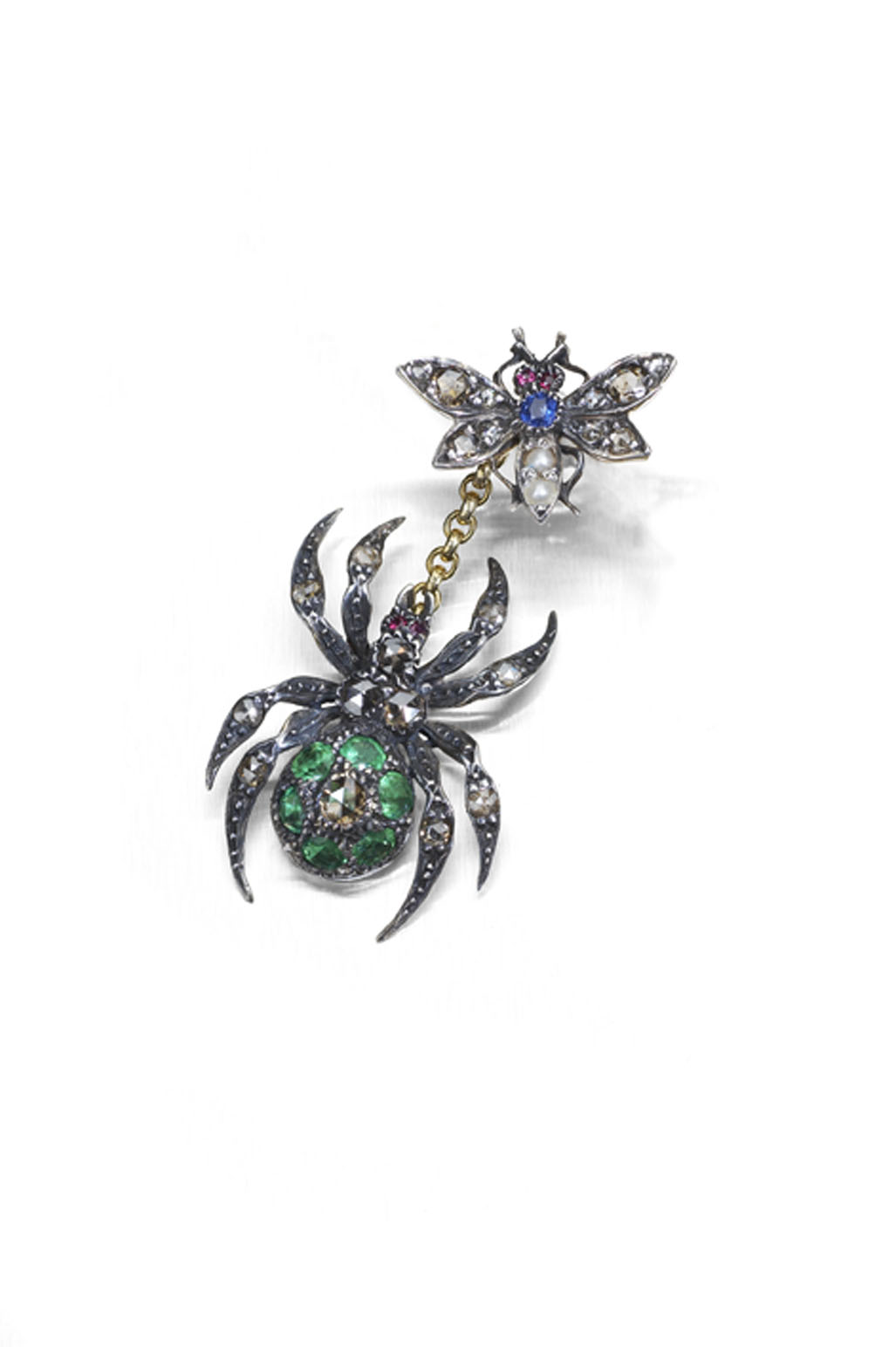 the plain bar applied with a multi-gem set fly, suspending a similarly set spider, conjoined by small belcher form links, set throughout with rose cut diamonds, circular cut emeralds and sapphires, circular cabochon cut rubies and seed pearls