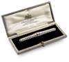 of shaped oval design, millegrain collet set to the centre with an old European cut diamond flanked to either side by ten graduated seed pearls, within a millegrain set rose cut diamond border, contained in a fitted case stamped EDWARD & SONS GLASGOW...