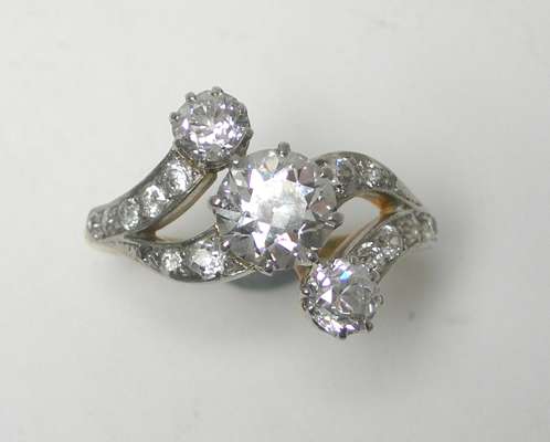 diagonally claw set with three graduated old European cut diamonds, flanked by split scroll shoulders, set with smaller similarly cut diamonds