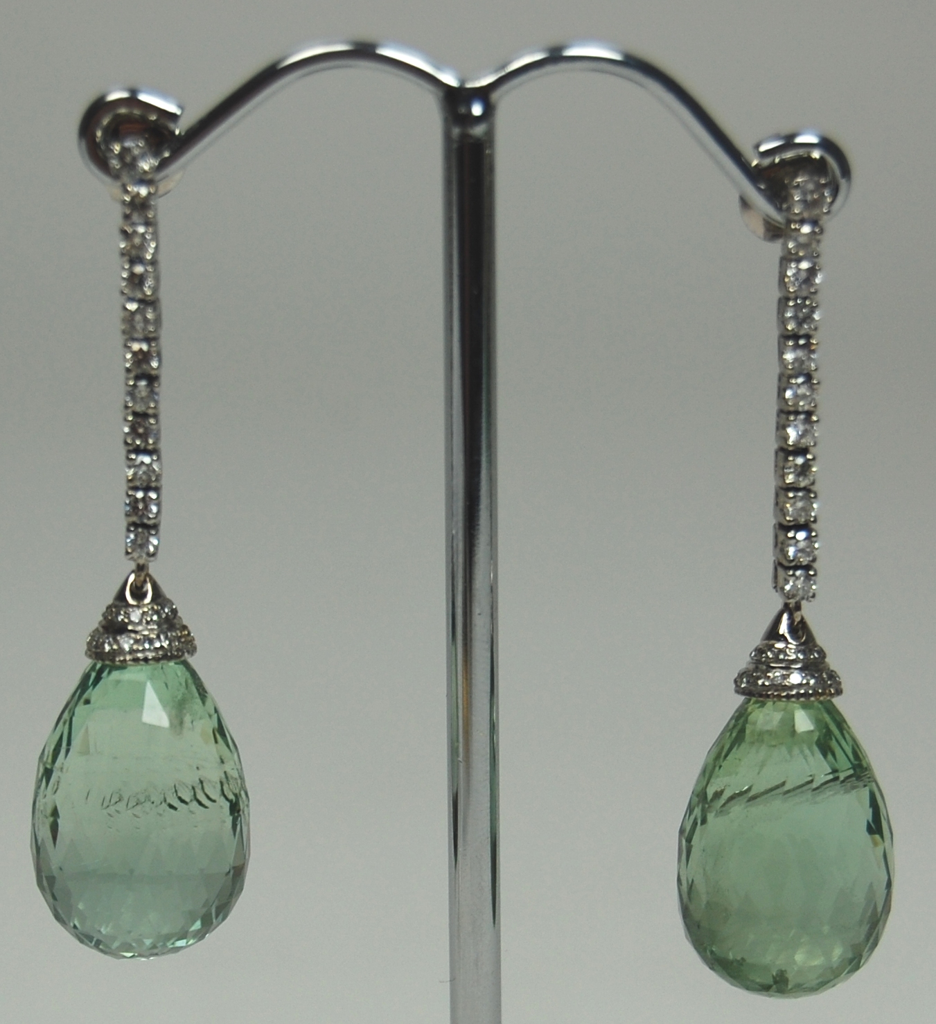 each composed of a line of claw set round brilliant cut diamonds, suspending a diamond capped large briolette cut aquamarine drop, with post and butterfly fittings