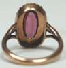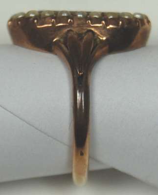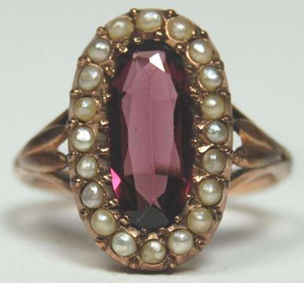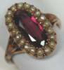 set to the centre with an oval cut garnet, within a surround of seed pearls, with foliate motifs to the shoulders