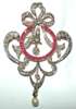 of scroll design, with bow-tied ribbon surmount, set throughout with graduated old European and rose cut diamonds, with calibre cut ruby set border, additionally suspending an ovoid cultured pearl drop