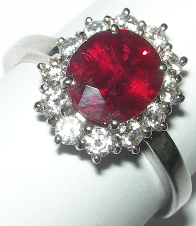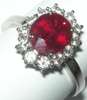 claw set to the centre with an oval cut ruby, within a surround of round brilliant cut diamonds