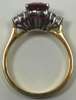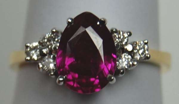 the central claw set pear cut ruby flanked to either side by three round brilliant cut diamonds