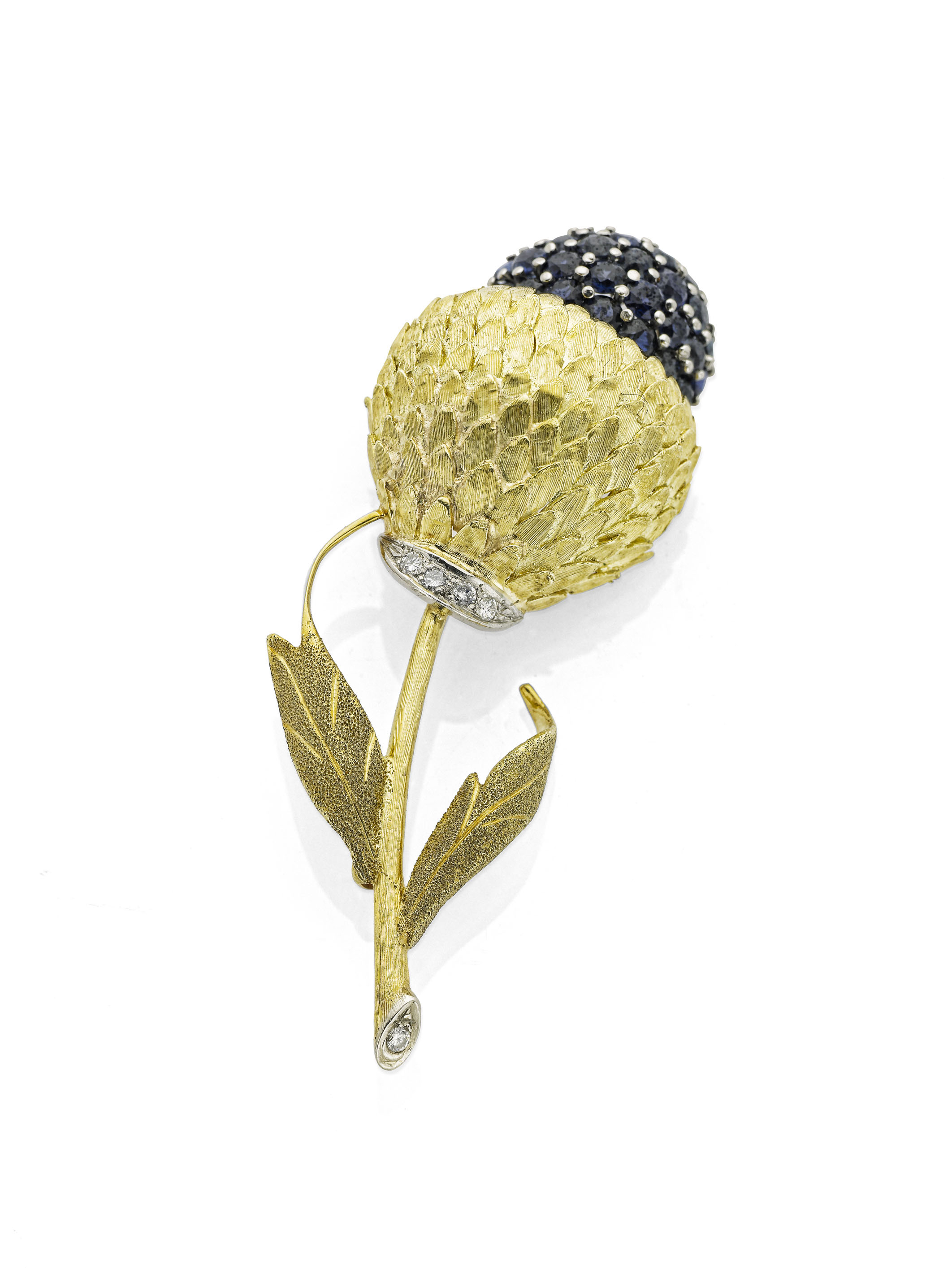 designed as a thistle with textured finish, set with graduated round brilliant cut diamonds, the upper edge claw set with graduated circular cut sapphires, signed E. PEARL and stamped 18K