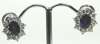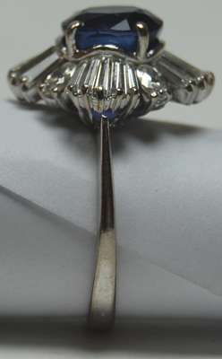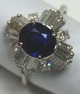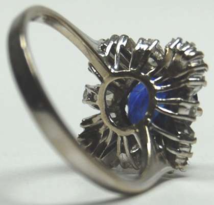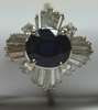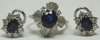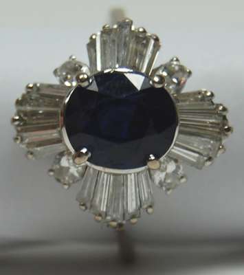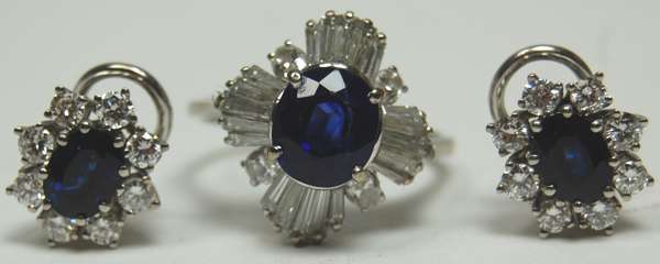 comprising a ring and a pair of earrings, the ring with central claw set oval cut sapphire, within an undulating shaped oval border set with oval cut diamonds and clusters of tapered baguette cut diamonds, the earrings each claw set with a similarly cut sapphire within a surround of round brilliant cut diamonds, mounts stamped 750