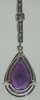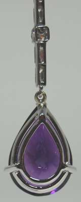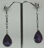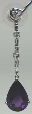comprising a pair of pendant earrings and a ring, the earrings each composed of a line of round brilliant and baguette cut diamonds suspending a pear cut amethyst drop, with post and butterfly fittings; the ring claw set with an oval cut amethyst, flanked to either side by three round brilliant cut diamonds (2)