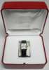 the white rectangular dial with black Roman and baton numerals, with blue cabochon set winder, fitted to a black leather strap with fold-over clasp, contained in the original tooled red leather fitted box