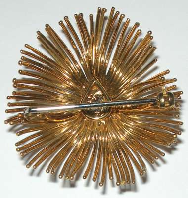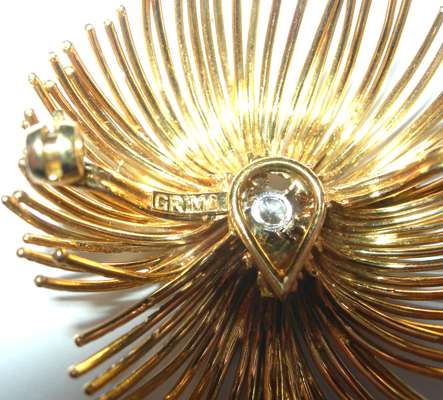 hallmarked for London 1967, also stamped GRIMA, designed as a stylised flowerhead, composed of radiating textured wires, claw set to the centre with a round brilliant cut diamond