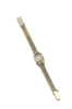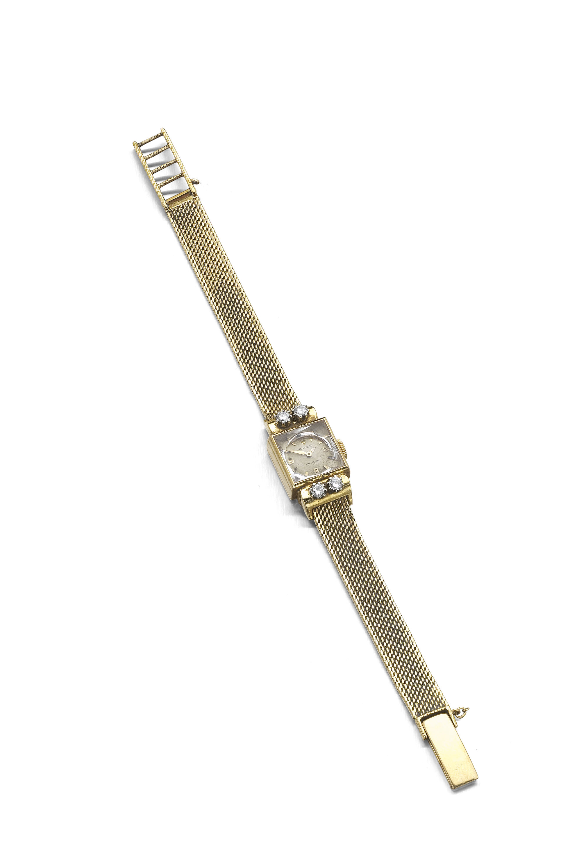 the champagne coloured circular dial with gilt Arabic and baton numerals within a square watch head, flanked to each shoulder by two claw set round brilliant cut diamonds, fitted to a fancy interwoven bracelet, with adjustable fold-over clasp
