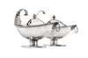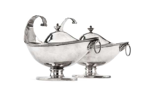 of navette outline with deep bowls, the rim with gadrooned details, raised scroll handle with acanthus terminal and shell detailed loop handle to point, raised on a simple waisted stem and a plain spreading foot, the domed pull off covers with simple urn finial (2)