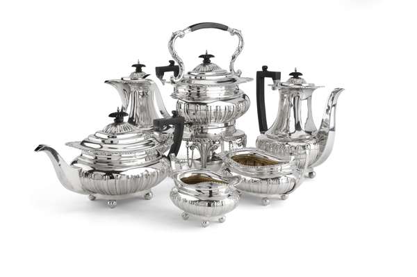 by James Deakin & Sons, Sheffield 1909 (hot water pot 1907),comprising spirit kettle and stand, hot water pot, coffee pot, teapot, twin handled sugar bowl and milk jug, each of baluster form with fluted bodies and everted gadrooned rim with shell detail (6)