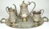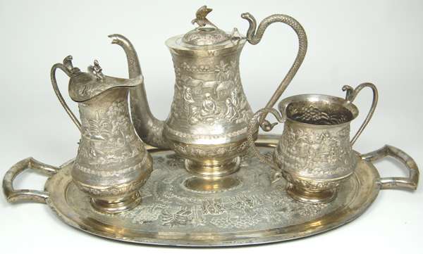 apparently unmarked, comprising coffee pot, covered milk pot, twin handled sugar bowl and twin handled tray, each piece heavily embossed with intricate rural landscape with figures and trees etc, with cobra formed handles (4)
