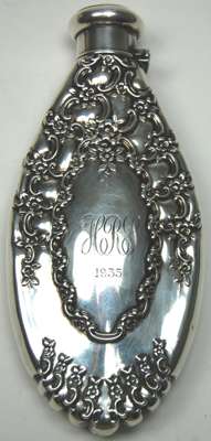by Tiffany & Co. New York, of oval outline with embossed scroll and floral design and oval formed cartouche, with engraved initials 'HRJ 1935', the hinged screw off domed cap with similar decoration