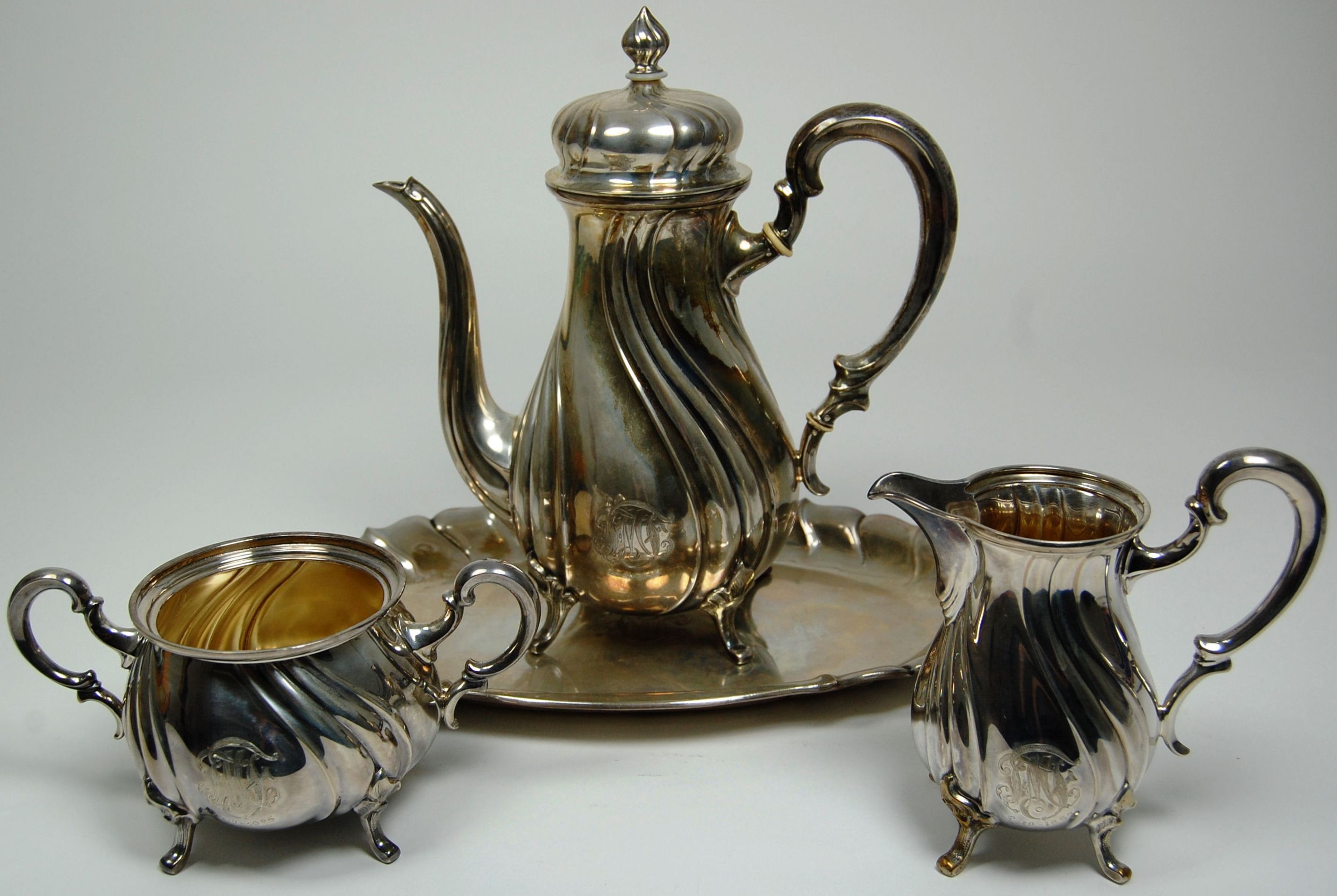 probably Austrian, comprising coffee pot, milk jug, twin handled sugar bowl and tray, the slender bodies with part spiralled fluted design and raised on scroll feet, the oval outline tray with fluted details (4)