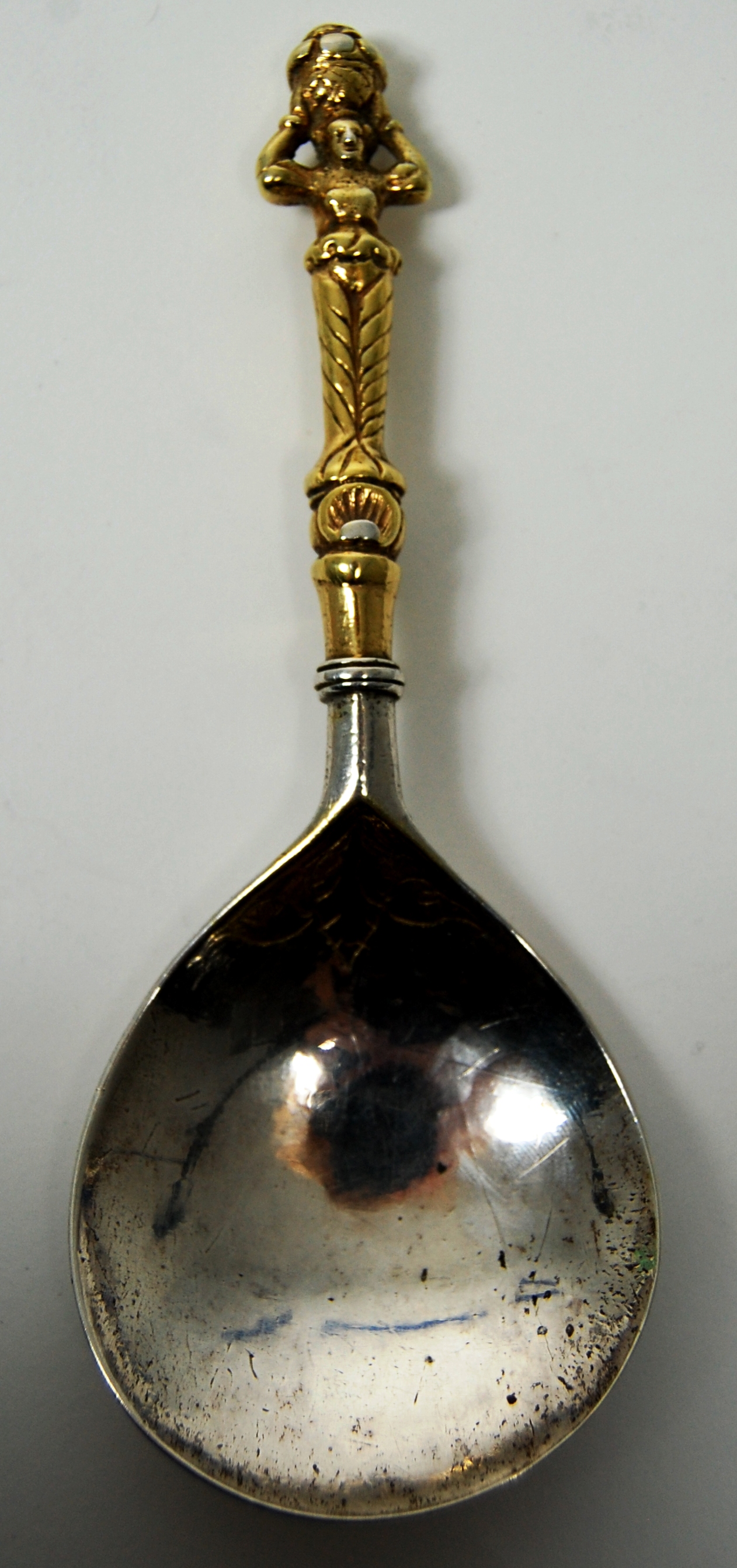 with indistinct mark to base of stem, the parcel gilt stem and finial formed as a female figure with a basket aloft, the tear shaped bowl with engraved and gilt foliate section, engraved to the reverse of the bowl *B*S*