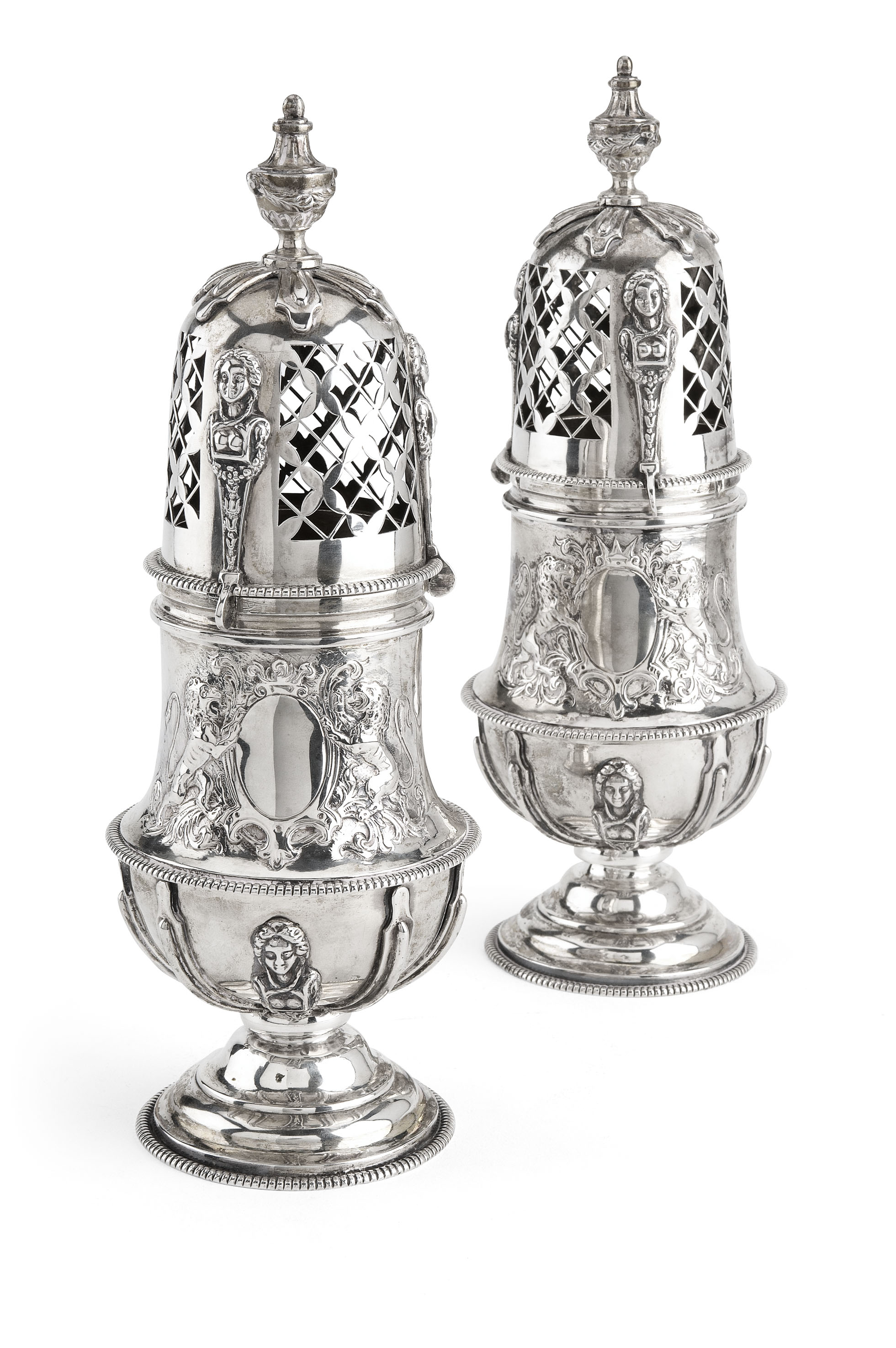 with 18th century Amsterdam marks, maker I*S, of baluster form with gadrooned mid girdle with applied cut card and cast lobes and figures below and the upper section with coat of arms with vacant centre and lion supporters, on domed spreading foot with gadrooned rim. the covers with three pierced panels and cast figures between the urn finial surmounting cut card decoration (2)