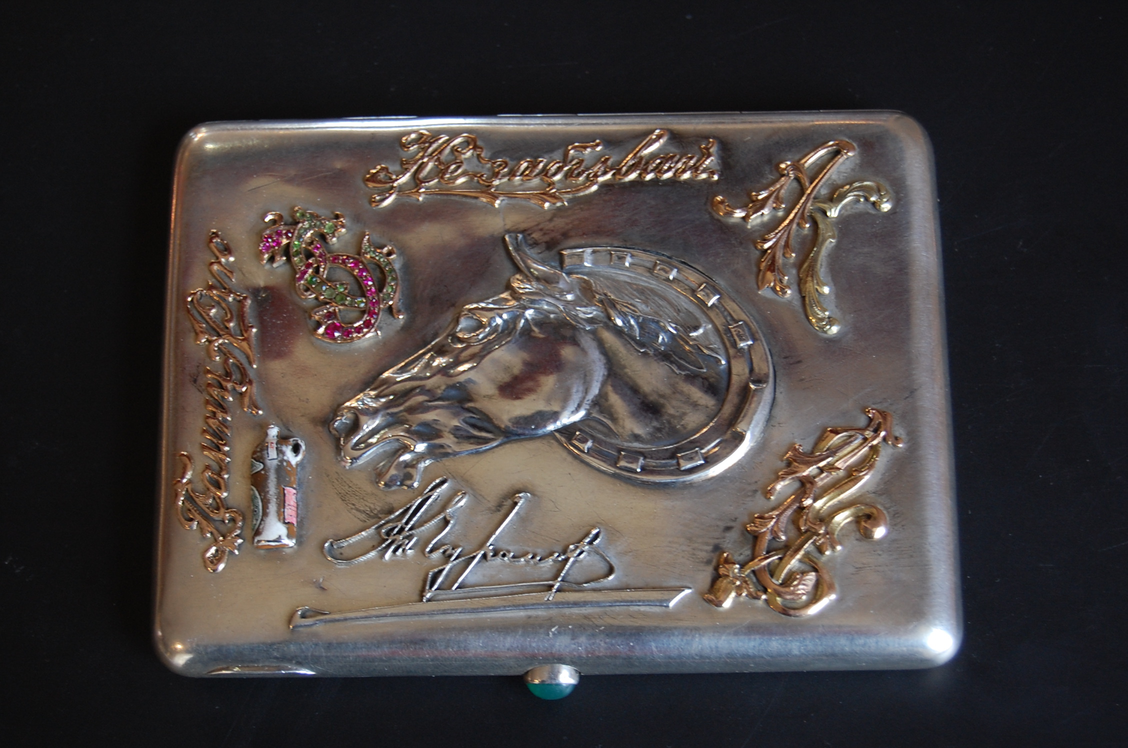 Moscow 1908-17, the body with later applied motifs including names, monograms (one gem set), a large horse's head and horseshoe motif, with engraved inscription
