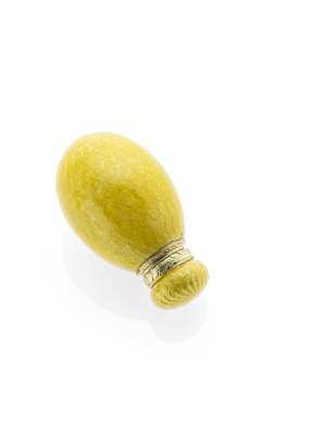 with 56 mark and maker's initials for Michael Perchin, of ovoid form with hinged cushion shaped cover, with foliate border, decorated throughout with yellow guilloche enamel