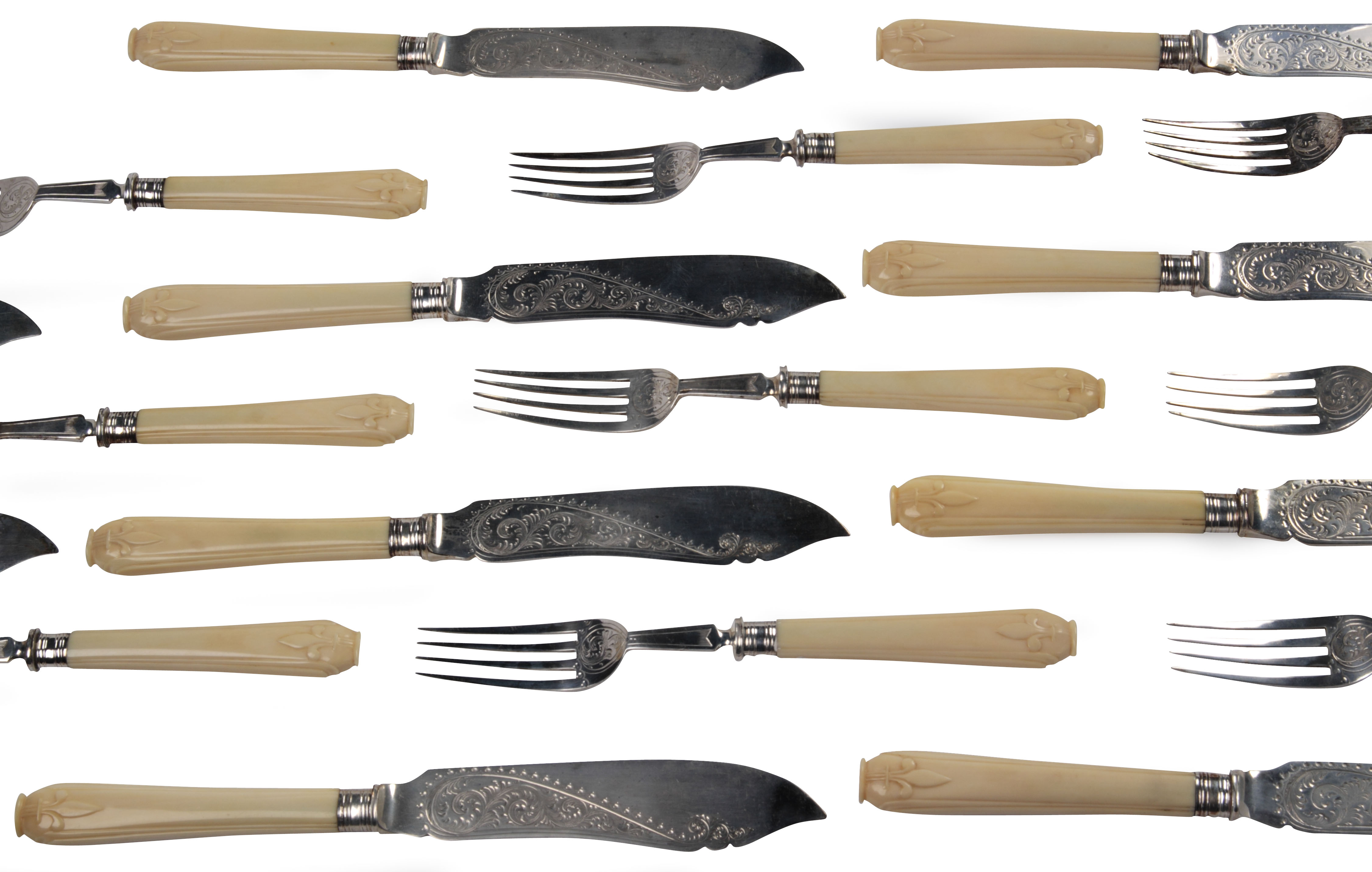 Mappin & Webb Sheffield 1899, the tines and blades with engraved scroll decoration, with flared carved ivory handles with fleur de lys detail to terminal, contained in original three tray fitted canteen