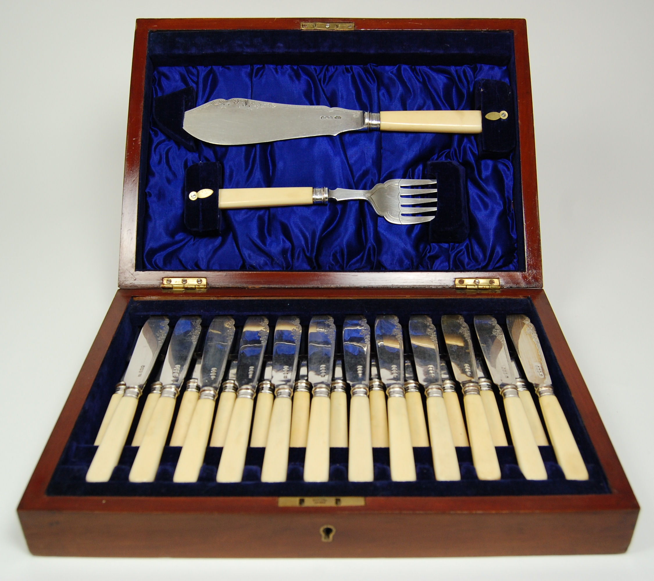 comprising: twelve pairs of fish knives and forks; and a pair of fish servers, all with simple shaped blades and tines with engraved decoration, with rounded ivory handles, contained in an original fitted canteen (26)