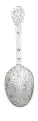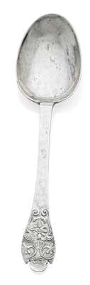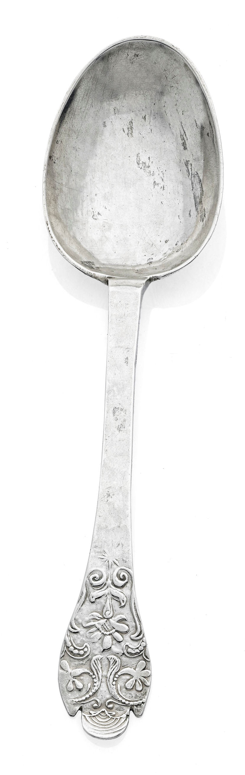 by Mary Sweet of Crewkerne, circa 1699, stem marked makers mark thrice, the decorated trefid terminal with flower heads and beaded scrolls the reverse prick engraved IM / Mo / 1699, the reverse of the bowl with floral scroll decoration around a simple rat tail