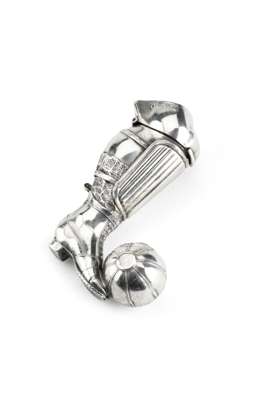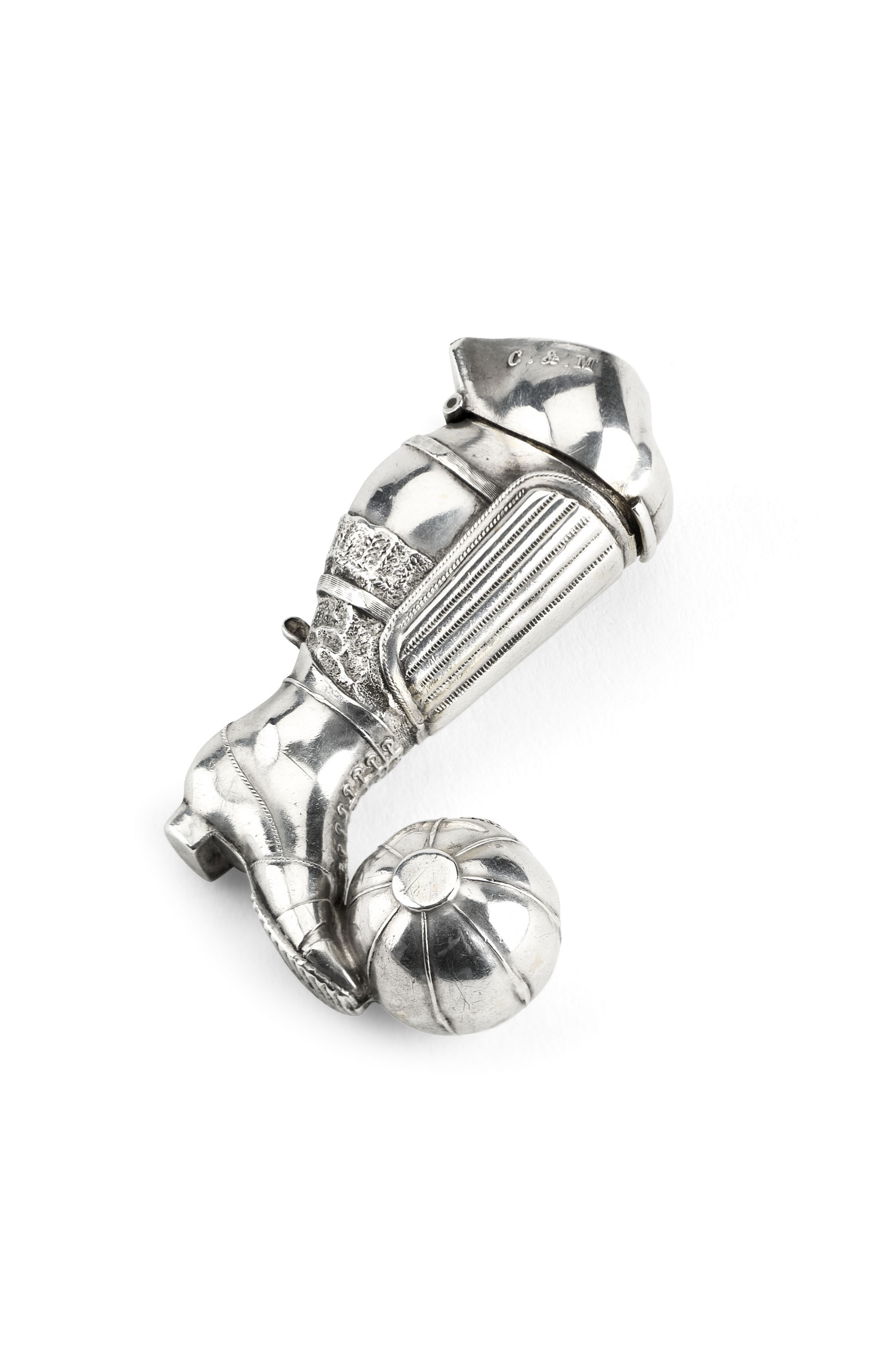 by SB&S, Birmingham 1884, formed as a footballer's leg kicking the ball, the hinged cover embossed C&M PATENT, and with later inscription 'JIM to JOE'