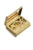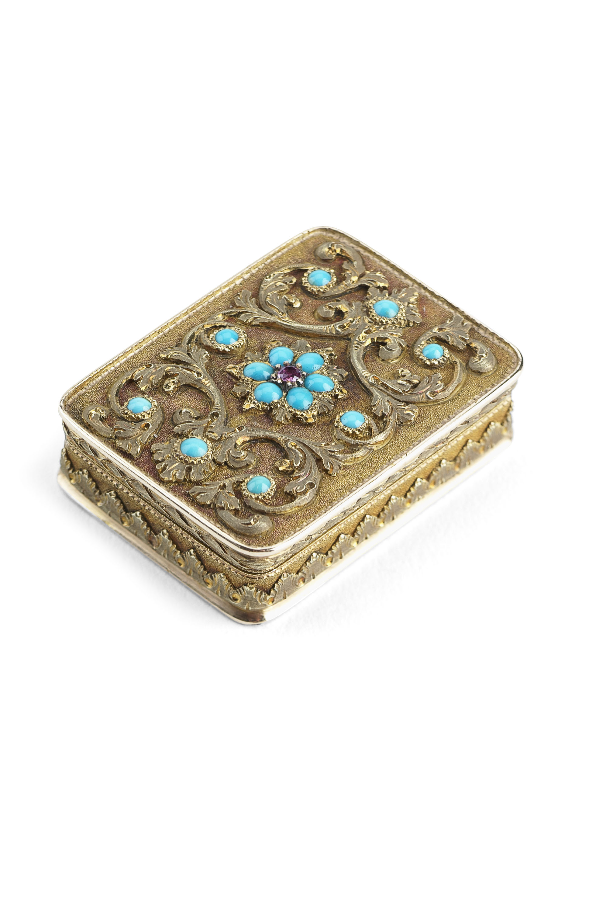 unmarked (but tests as gold) with finely applied scroll design to cover set with cabochon turquoise detail and flower head to centre, the sides with acanthus border and matted ground, the hinged grill finely pierced and engraved as two birds within foliate, in original leather pouch with gilt inscription 'Sutherland & Horne Jeweller and Silversmiths......Edinburgh...'