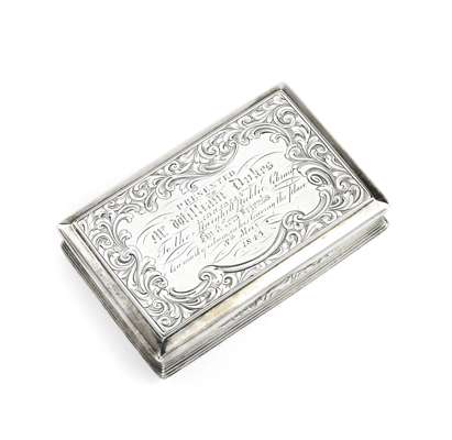 by Nathaniel Mills, Birmingham 1844 of simple rectangular form with reeded sides, the hinged cover with engraved foliate scroll border and inscription to centre 'presented to Mr William Dukes Librarian of the Maryhill Public Library by a few friends.....'