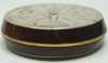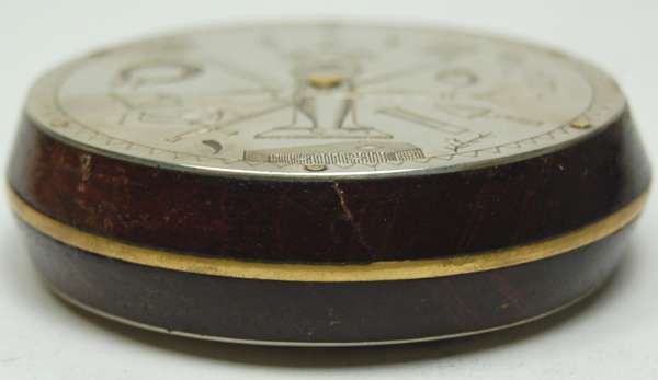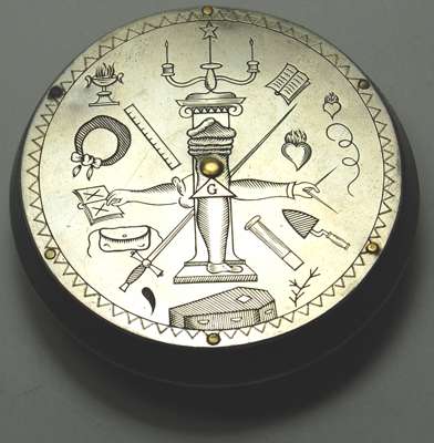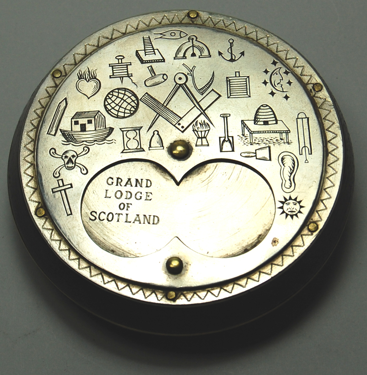 the circular wooden box with applied white metal base and cover, the cover with sliding action to reveal the interior, both cover and base engraved with numerous Masonic symbols, the lid additionally inscribed 'Grand Lodge of Scotland'