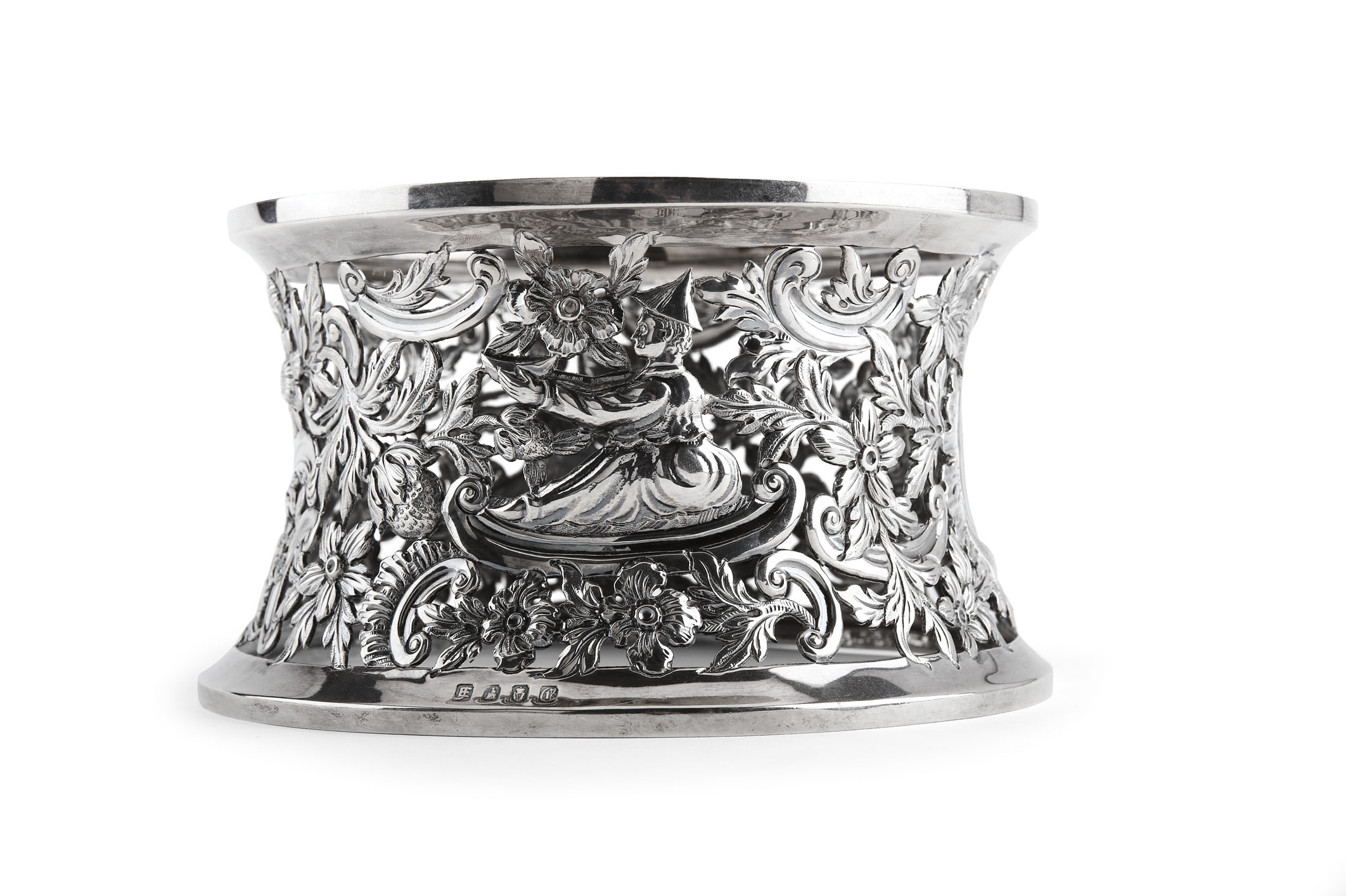 makers mark EJ in monogram, Dublin 1900, of typical form with embossed and pierced decoration of fruiting and flowering vines with large vacant scroll formed cartouche, with decoration of two seated oriental figures in the chinoiserie style