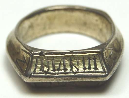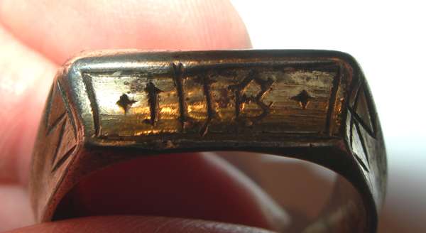 the bevelled front with engraved indistinct inscription including IHS, flanked to each shoulder by engraved triangular motifs, to a scroll shaped shank