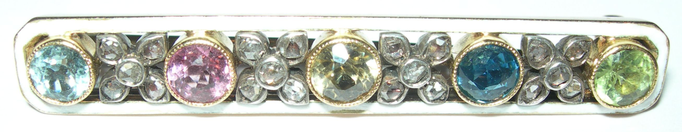 of slim oval design, millegrain collet set with assorted circular cut gems, interspersed by rose cut diamond set floral motifs, with white enamelled outer border