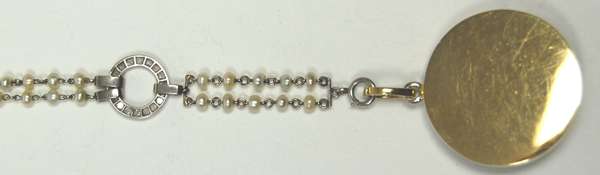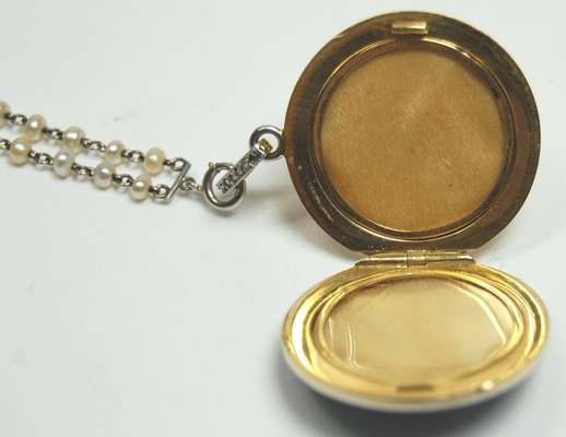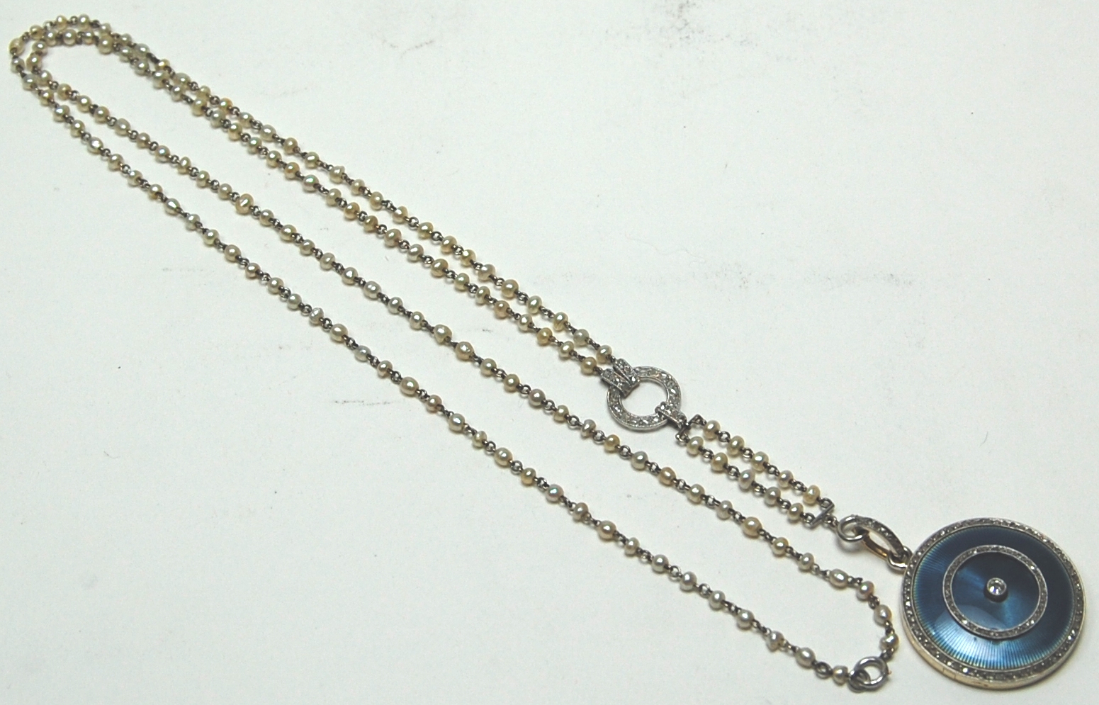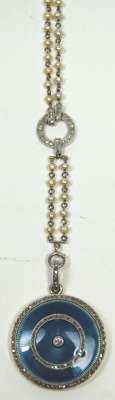 composed of seed pearls and fine belcher form links, with open circular spacer, millegrain set with rose cut diamonds, suspending a pale blue guilloche enamel decorated circular locket, additionally decorated with similarly cut diamond set borders