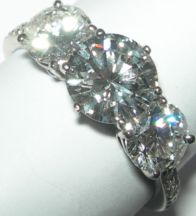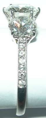 claw set with graduated round brilliant cut diamonds, additionally millegrain set to each shoulder with seven smaller similarly cut diamonds