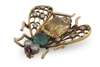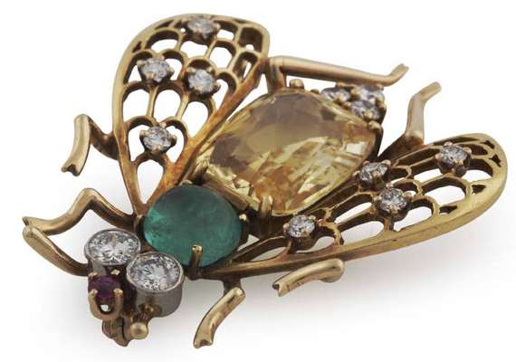 designed as a winged insect, with collet set round brilliant cut diamond set eyes, surmounted to the centre by a circular cut ruby, with claw set circular cut emerald cabochon set thorax and similarly set cushion cut yellow sapphire set abdomen, the pierced wings also claw set with smaller round brilliant cut diamonds, signed to reverse VAN CLEEF & ARPELS N.Y. and numbered 20420