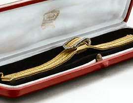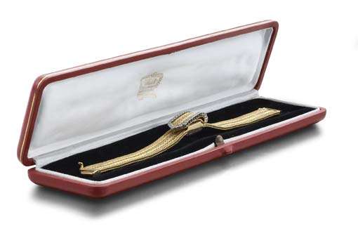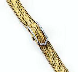 designed as a fancy herringbone link bracelet, with central hinged cover claw set with a border of round brilliant cut diamonds, concealing the rectangular champagne dial, with gilt baton numerals and hands, case numbered 9225, bracelet clasp numbered 6526, with original signed and tooled red leather fitted case