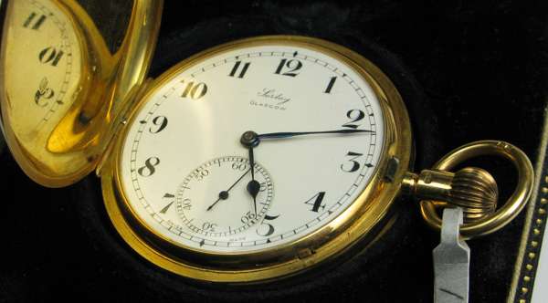 the full hunting cases with engraved monogram and inscription to inner cover, lever movement, swiss made, the white enamel dial inscribed Sorley Glasgow and with subsidiary seconds dial, all in a Sorley of Glasgow fitted box