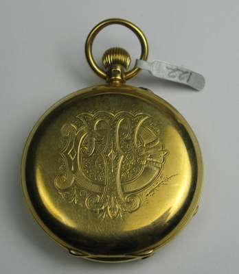 the full hunting case with engraved monogram, three quarter plate lever movement, plain enamel dial, with subsidiary seconds dial